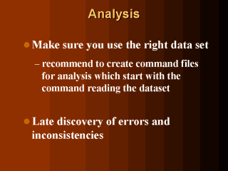 | Despite efforts to secure the data quality, you may still discover errors and inconsistencies during analysis. If you have been maintaining and documenting command files, you can go back and modify the correction command file and rerun this and subsequent command files. If you have not been documenting and maintaining command files, then the procedure may be time consuming - and risky. |