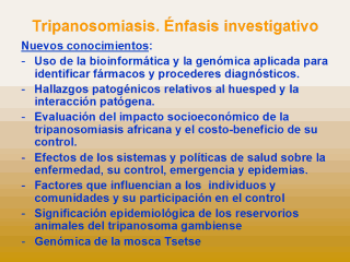 enfermedad en el SNC y determinar potencialidad de cura. Nuevos métodos de intervención: a) Significación clínico-epidemiológica del test de aglutinación directo e indirecto para el tripanosoma. b) Evaluación del tratamiento de corta duración con pentamidina, suramin y melarsoprol. c) Investigación de la melarsoprol-resistencia. Nuevas estrategias: Sostenibles y basadas en la comunidad para el control de la mosca Tsetse. |
