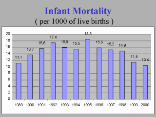| Infant mortality in the Baltic sates had always been lower than in the rest of the Czarist Russia or in the USSR. By 1988-1989 infant mortality rate according to the Soviet definition had fallen to 11 per 1000, and the value was close to the level in many developed countries. In the 1990s the rate has increased considerably, reaching 15.2 in 1997. However, by the end of the 1990s it declined again reaching 11.4 in 1999 and 10.4 in 2000. |