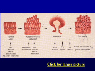 | Fundamentally, colon cancer follows something known as the adenoma-carcinoma sequence. Things begin as little polyps and over time they can evolve into cancers. Of course, we spend a lot of time on the genetic abnormalities that are associated with the progression from adenoma to cancer. |
