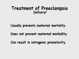 | The treatment of preeclampsia is delivery. It works well for the mother. It may not work well for her morbidity. But it can result in iatrogenic prematurity and it does contribute to the problem of the baby. |