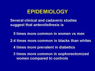 various theories as to why this is: A) because people are living longer; B) because there are more spinal surgeons around here if people choose be operated on. There are many, many theories about this but it certainly is true that the rate of surgical intervention for this condition is increasing very much. It is a very expensive operation. The one thing that there is a little data about is anterolisthesis which is vertebral slipping and that it is five times more common in women than men and 2-4 times more common in African-Americans than whites. It is said to be more prevalent in diabetics and women who are oophorectomized. |