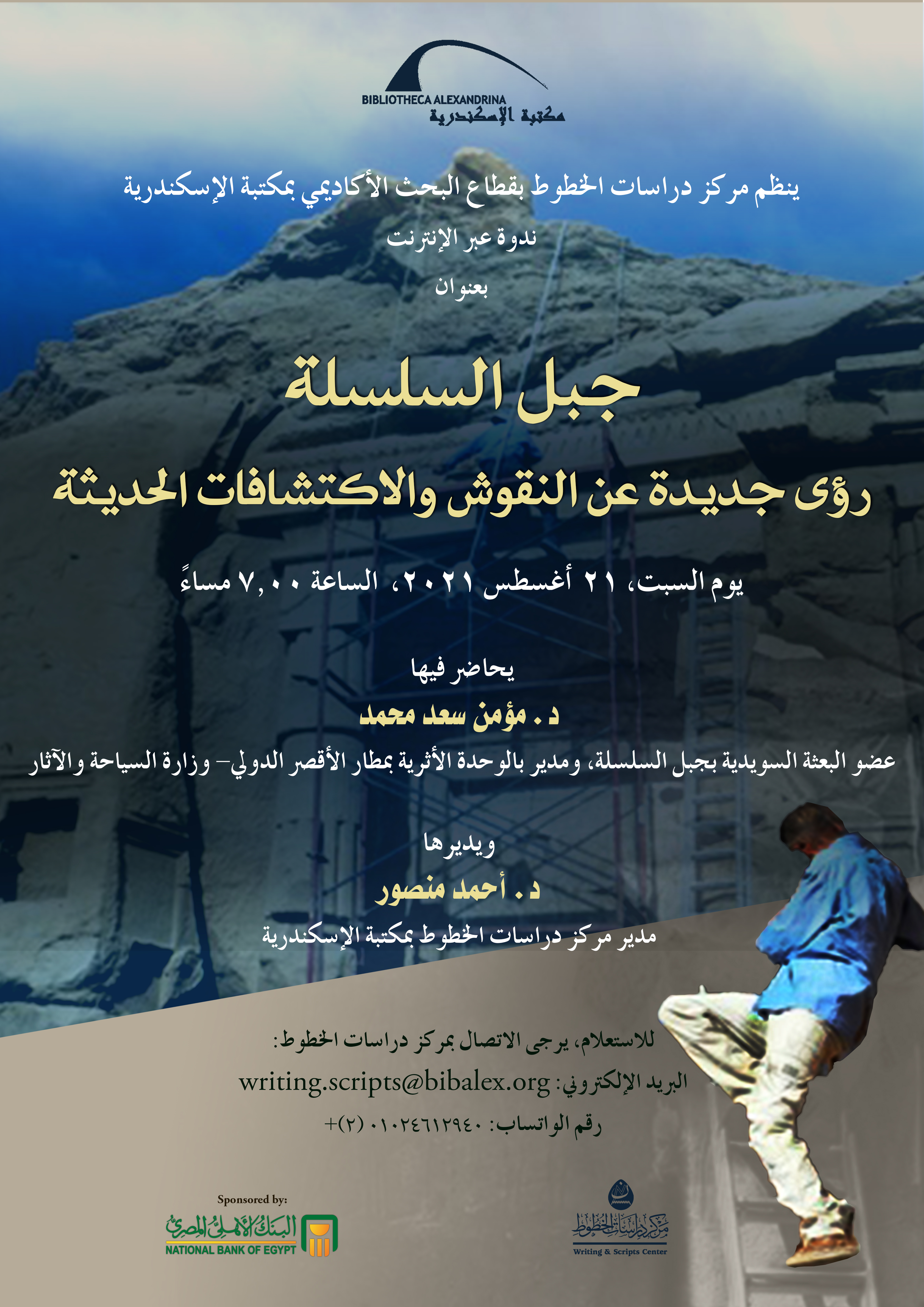 Within the framework of the cultural program of Bibliotheca Alexandrina’s Book Fair in its Sixteenth Cycle, the Writing and Scripts Center affiliated to the Academic Research Sector organized an online lecture entitled “Jebel al-Silsila: New Perspectives on Inscriptions and latest Discoveries”.