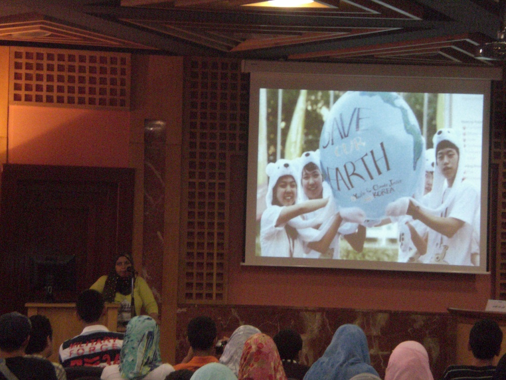 Then, Sarah El Shater gave a presentation about the same subject from the perspective of youth; their role in facing this global issue away from leaders’ conferences and agreements and she displayed different youth acts and activities in favor of global warming.